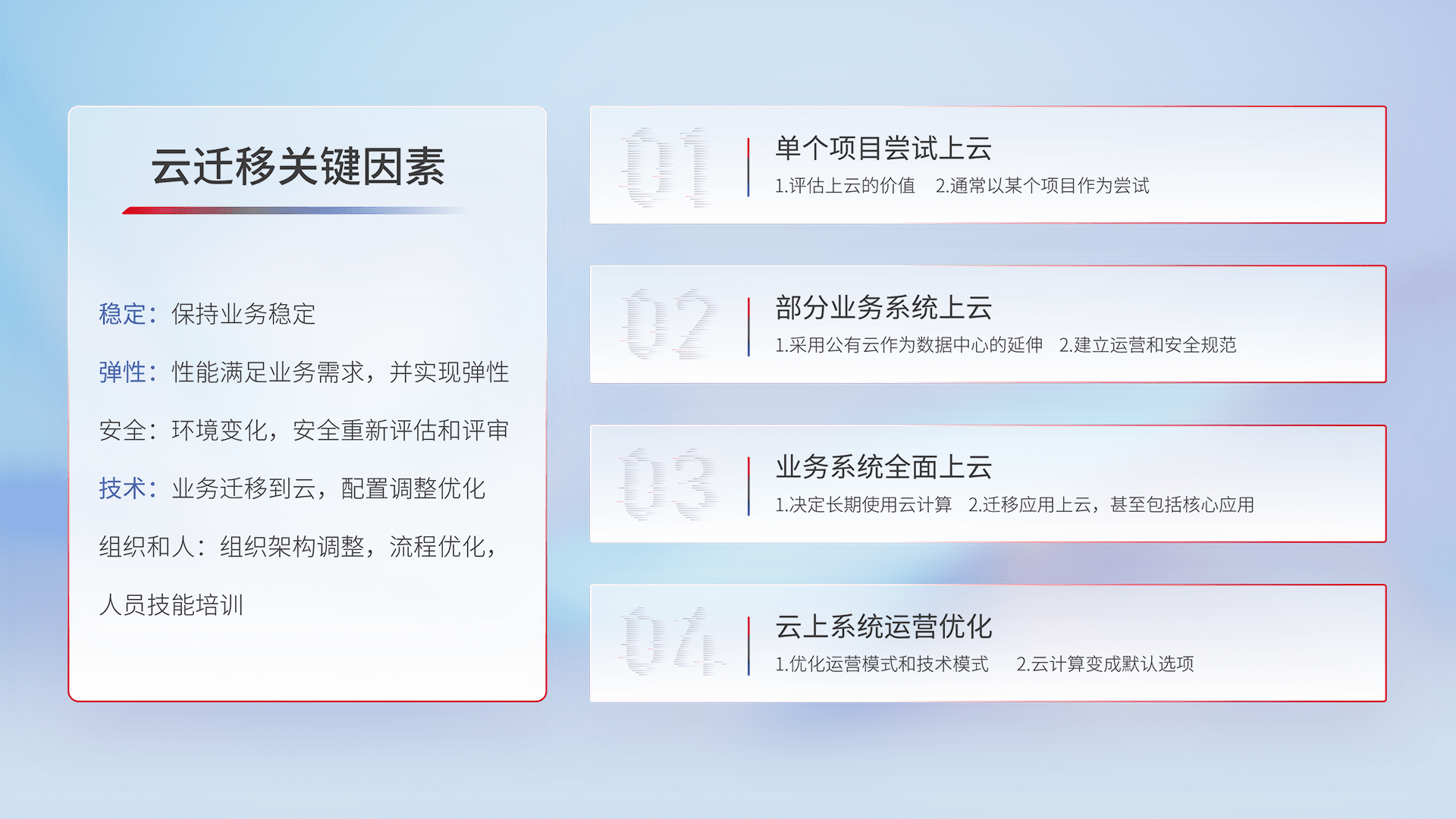 结合实际业务,,,从规划设计、、云平台选型、、云原生改造、、、数据迁移、、集成交付,,迁移全过程为客户识别最佳上云路径,,,,做好风险识别管理,,,,设计网络架构、、、、身份权限、、安全审计合规、、、、操作审计、、、、日志审计、、监控告警策略、、多站点容灾设计等,,,对云上基础设施进行整体规划,,,,提升IT治理水平,,,,以满足弹性、、、高可用、、高性能的需求。。。。