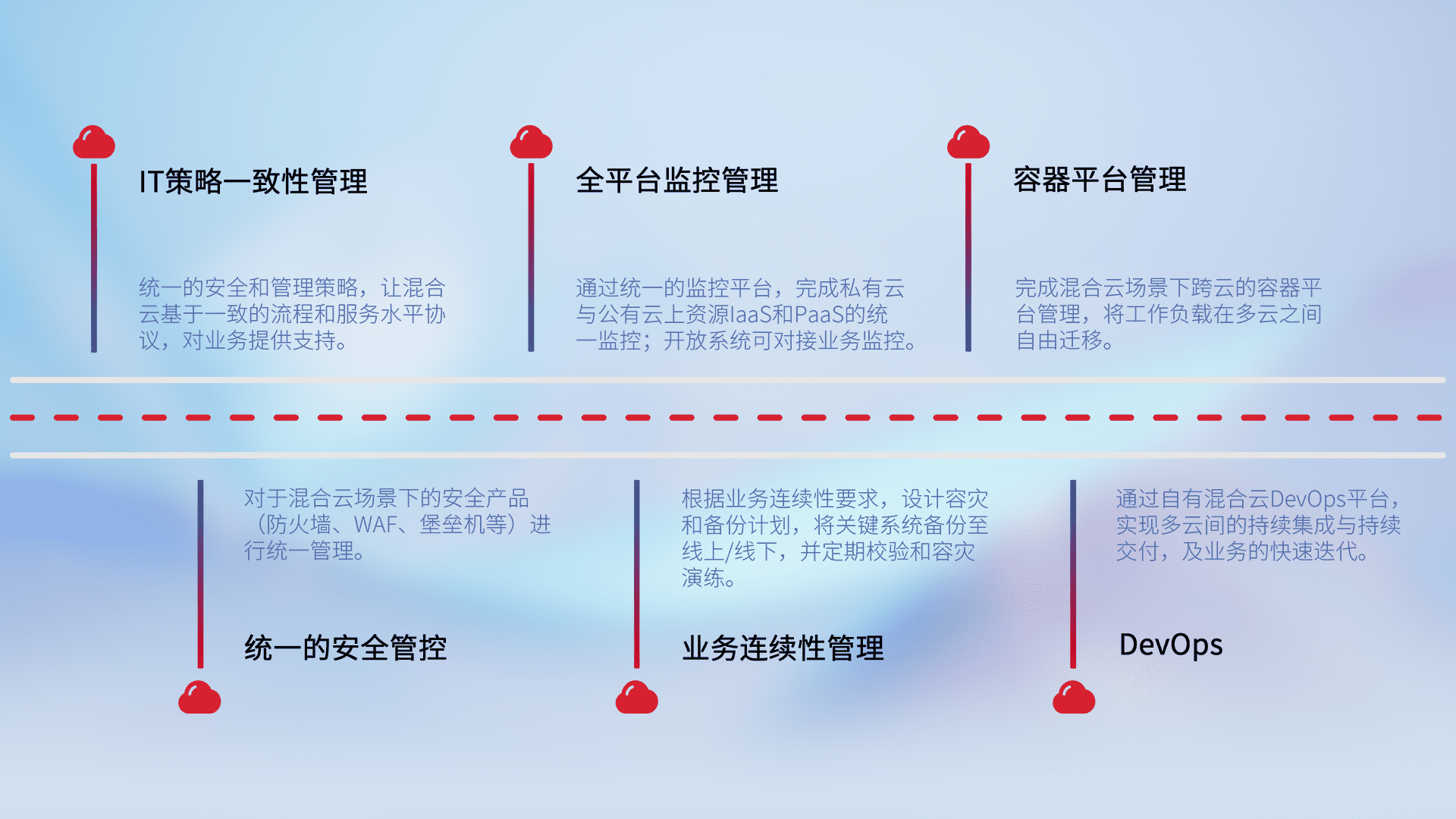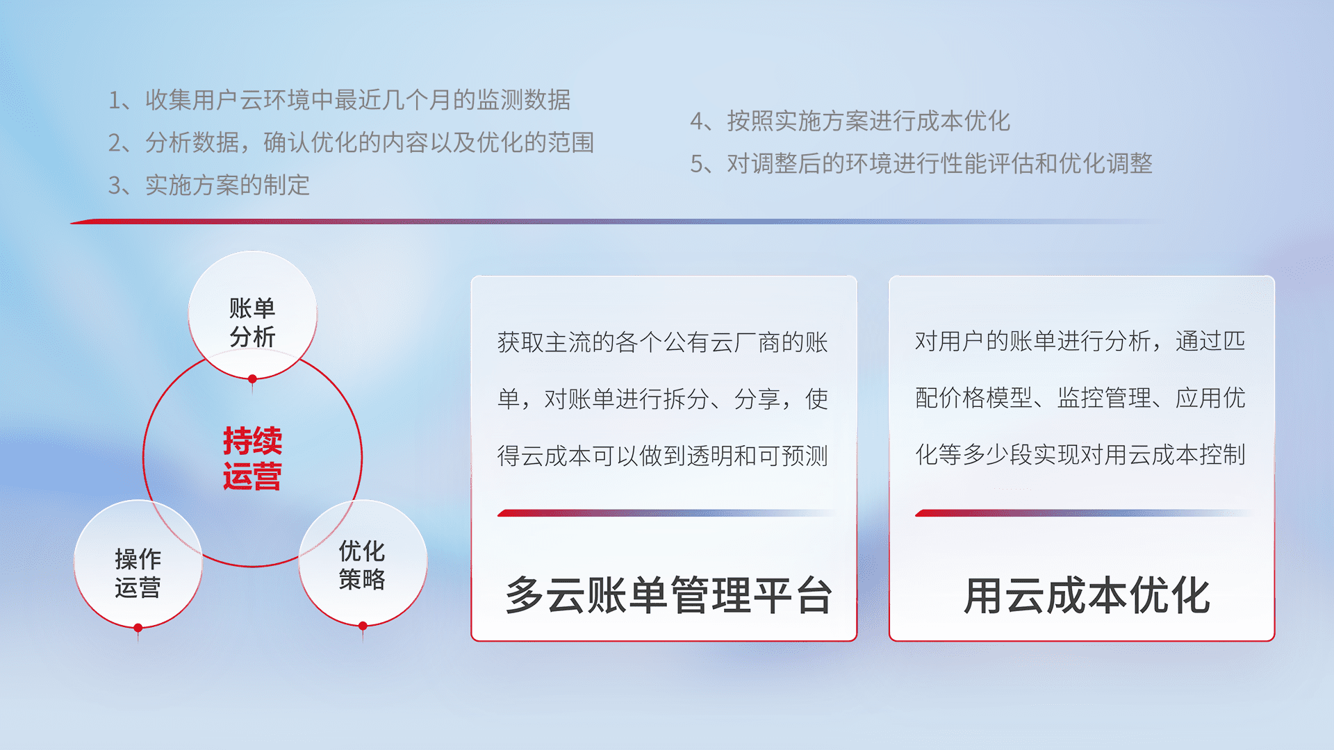 通过多云纳管,,,以统一的资源数据模型把客户的云资源进行抽象和封装,,,进而实现对多云资源的统一操作,,,,保障云资源管理的可靠性、、、、稳定性与可用性。。。。量身定制化运维内容,,,配置、、、、开发运维、、、、补丁管理、、备份、、监控、、认证和访问管理、、、、审计和日常巡检等,,,保障在用云过程中的可靠度,,,,稳定度以及高可用率。。。