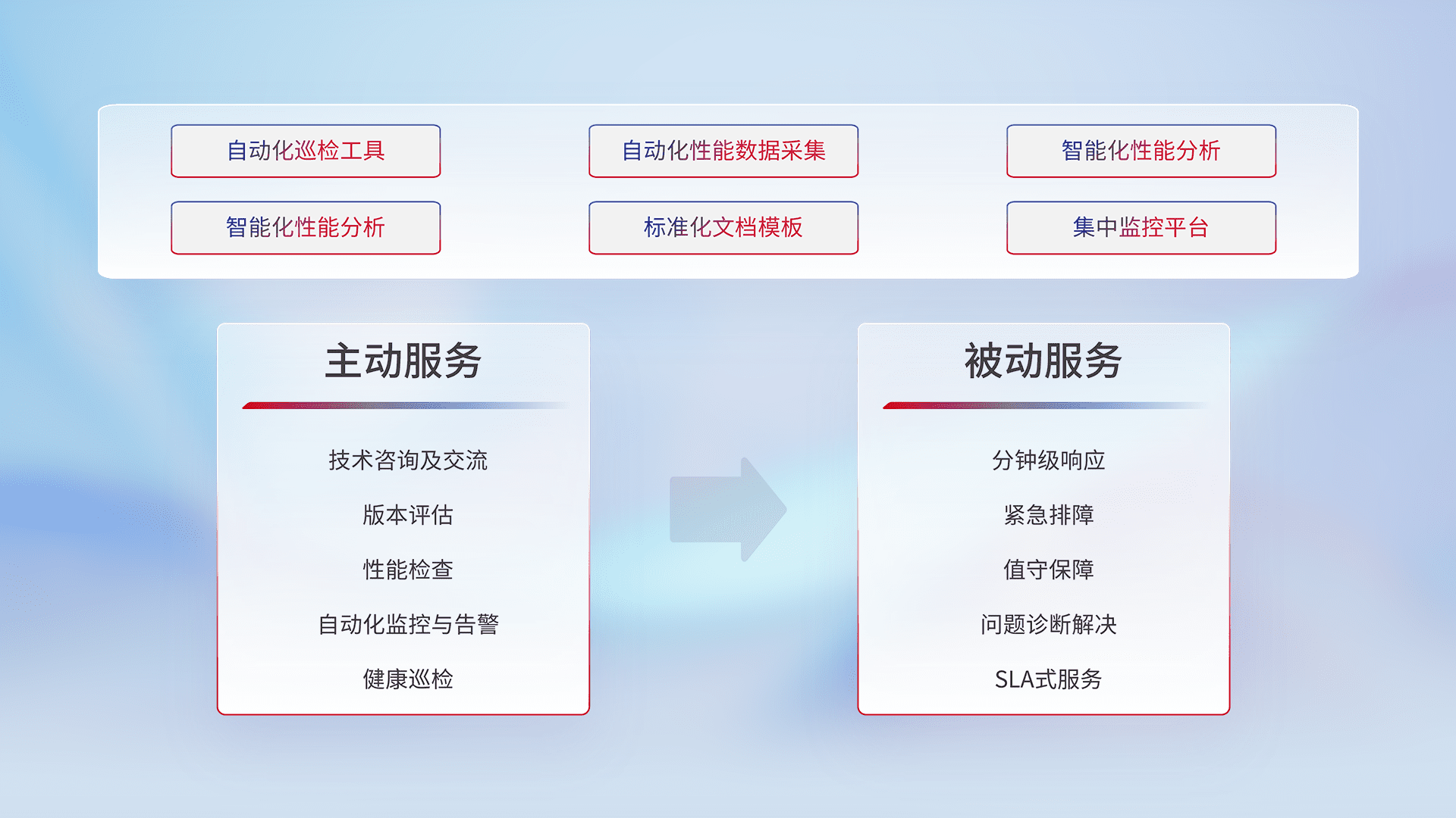 智能化工具和标准化文档,,保障服务质量,,,提供主动服务(包含技术咨询、、、、版本评估、、、性能检查、、、、自动化监控与告警、、健康巡检)和被动服务包含(分钟级响应、、紧急排障、、、值守保障、、、、问题诊断解决、、、SLA服务)。。